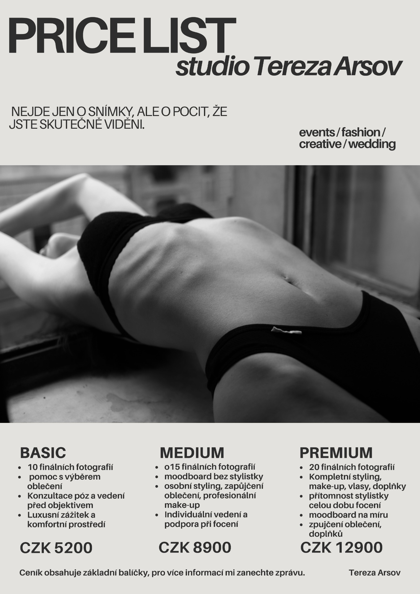Všechna focení probíhají v klidném tempu, s vedením, podporou a respektem k tomu, kým jsi. Nemusíš vědět, jak pózovat, ani mít zkušenosti před objektivem. Provedu tě celým procesem krok za krokem. Představuji vám můj základní ceník tří balíčků focení.